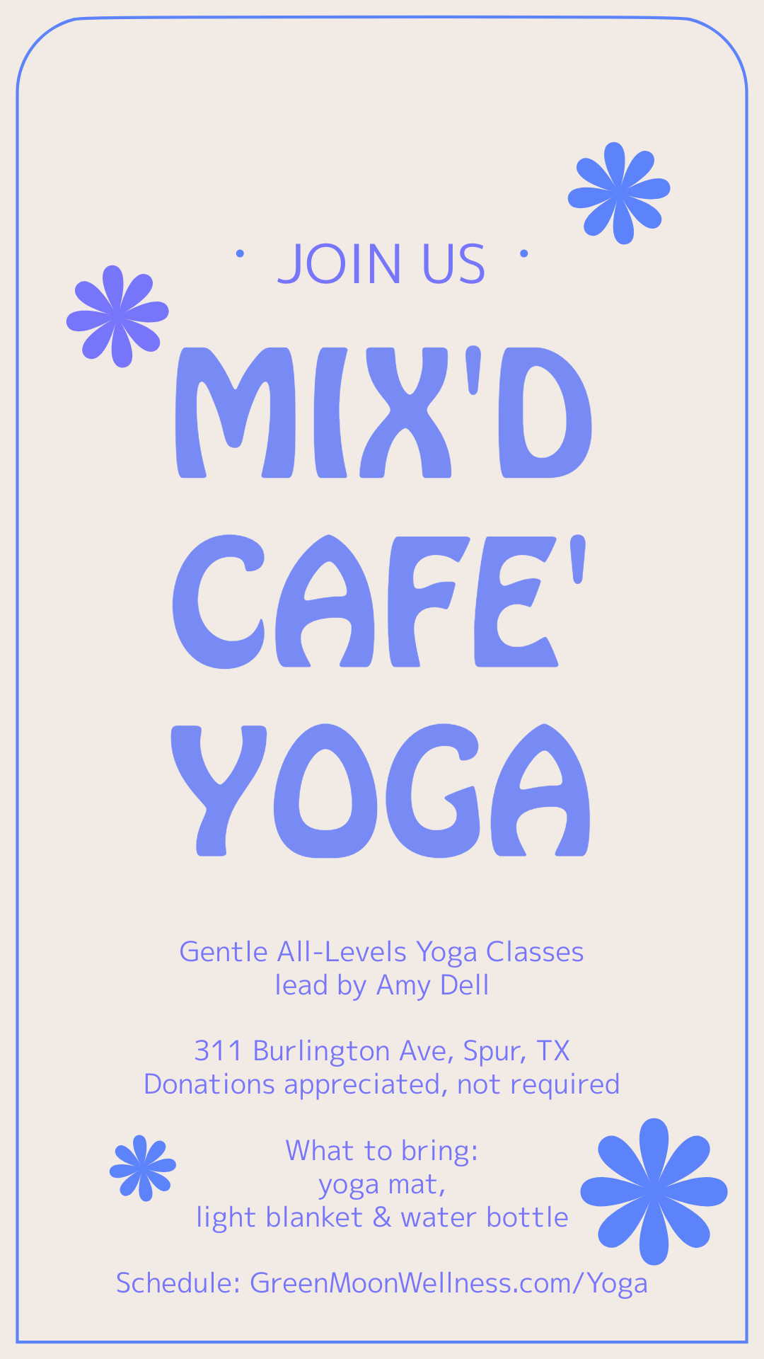 Flip through calendar for scheduled classes *Facebook @GreenMoonWellness Yoga Classesw/Amy Dell@ Mix’d Cafe’311 Burlington AveSpur, TX